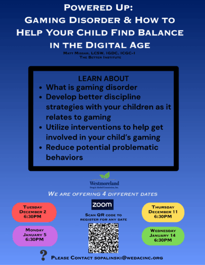Learn how to help your child find balance in the digital age. This webinar will provide parents/caregivers information gaming disorder, better disipline srategies when comes to gaming, interventions to get involved in your child’s gaming, and more…